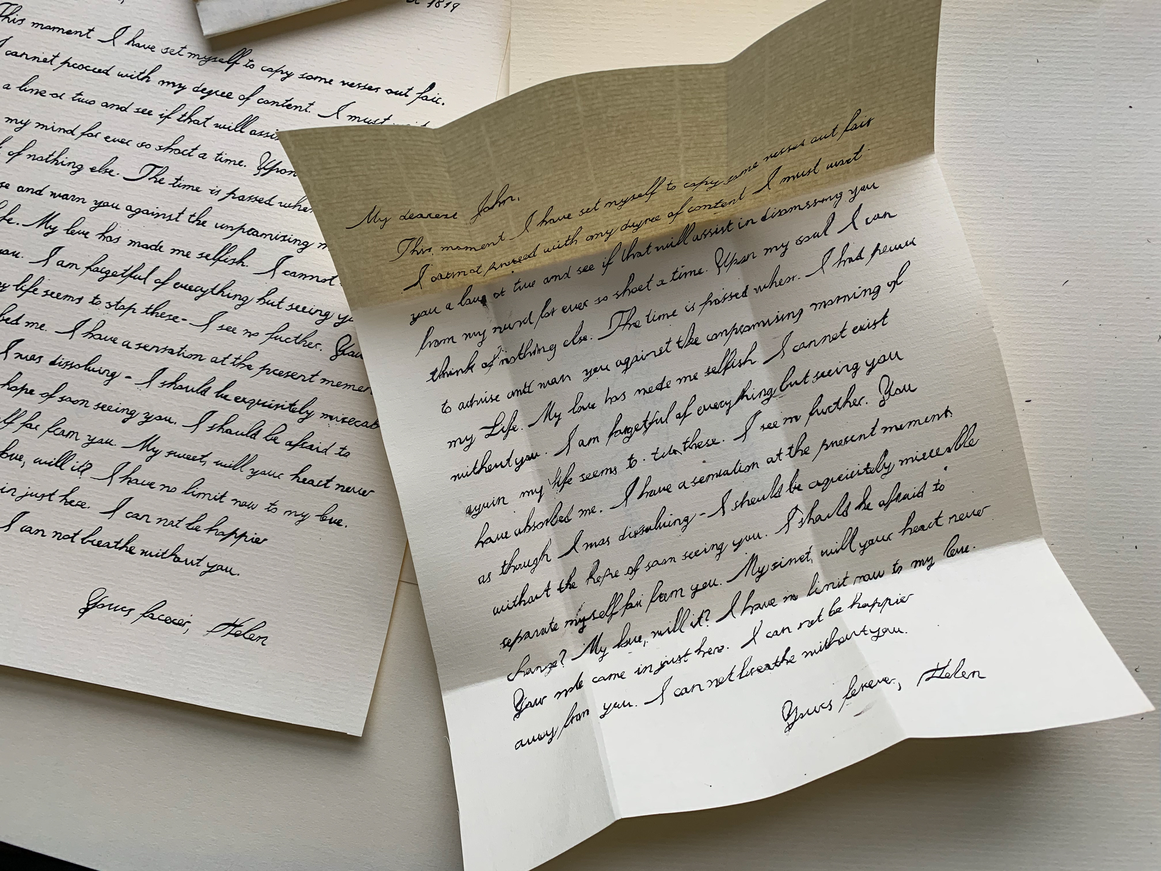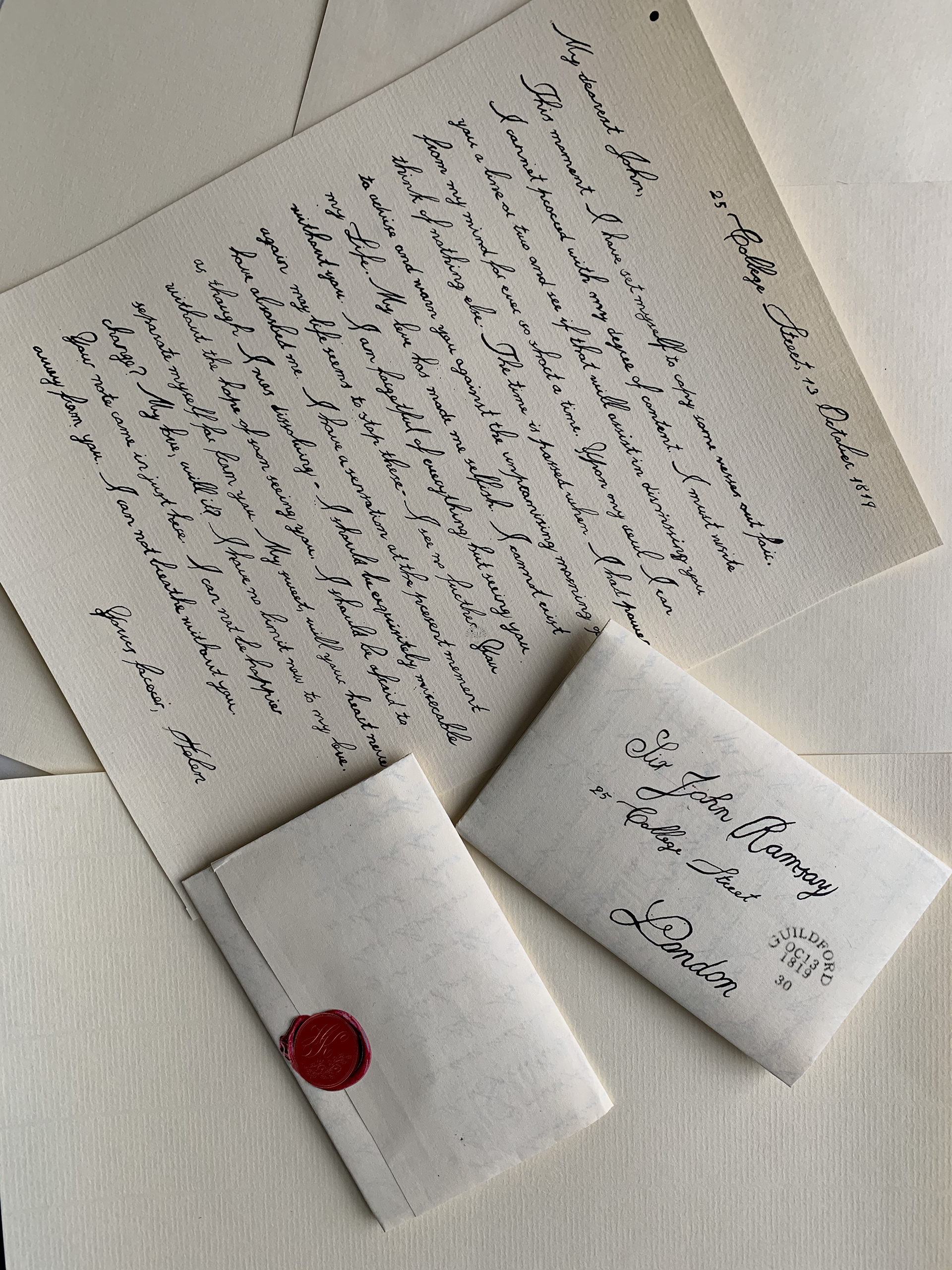 Written with metal tip pen and ink on fake laid paper, with sealing wax and postal mark stamp